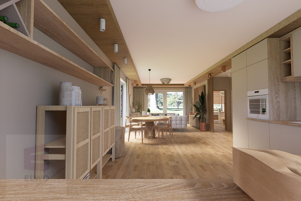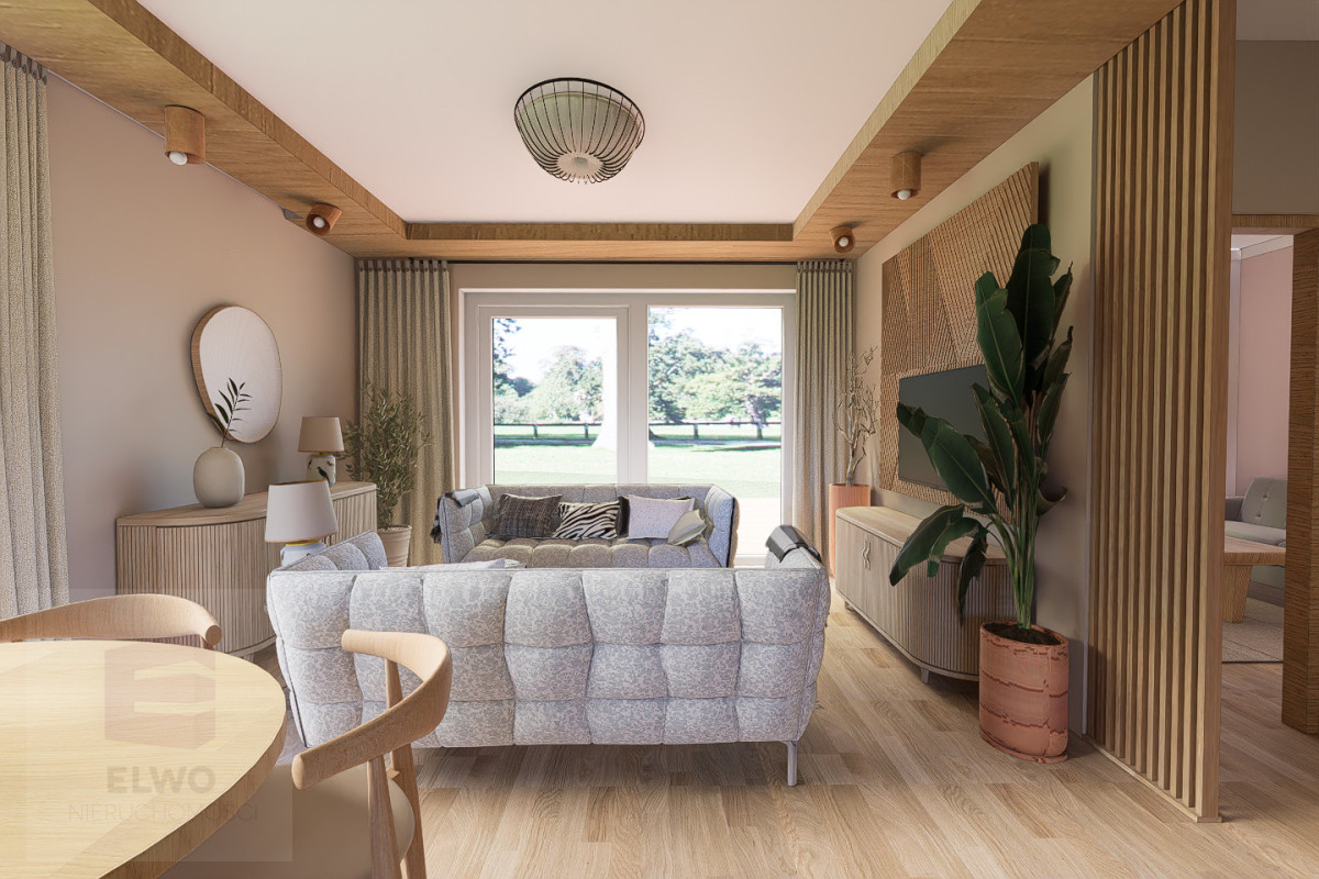 Parter: salon z aneksem kuchennym i jadalnią + pokój/biuro + łazienka z wc, prysznicem i umywalką + korytarz + schowek.