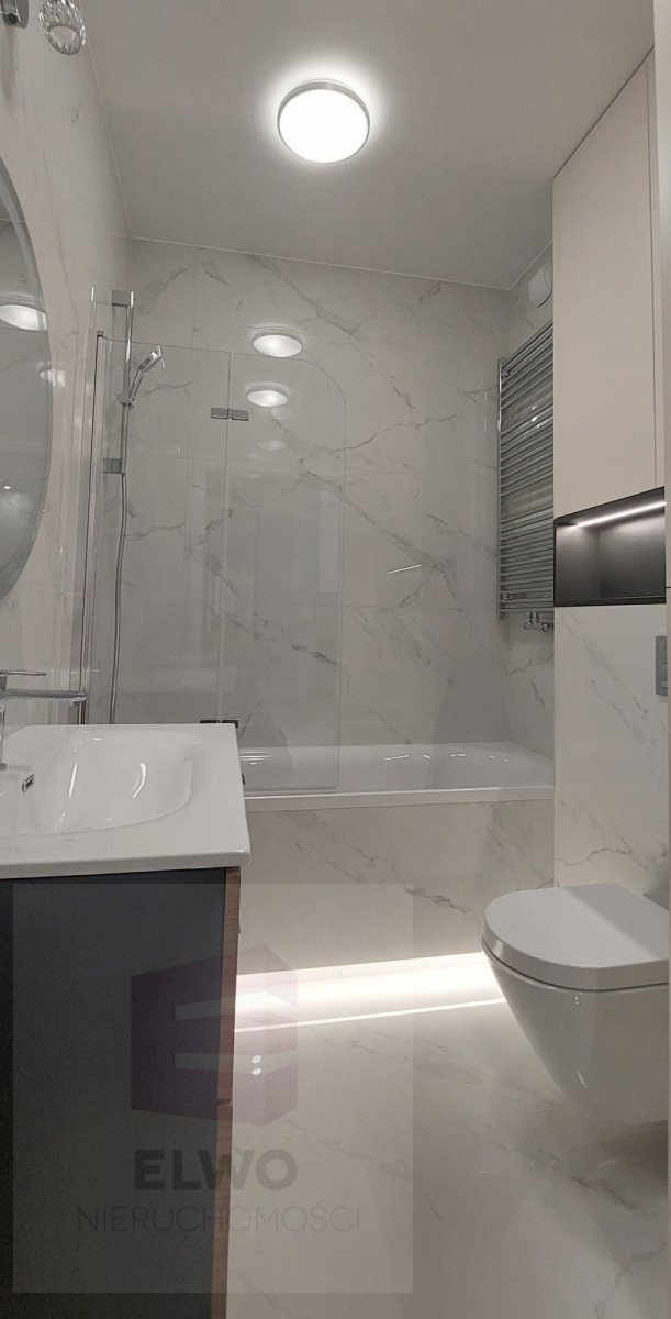 i składa się z salonu z otwartą kuchnią przedzieloną miejscem do pracy lub spożywania posiłków, sypialni, przedpokoju oraz łazienki z wc. Mieszkanie, dotychczas jeszcze nigdy nie wynajmowane, posiada klimatyzację oraz wyposażone jest w nowy sprzęt AGD (piekarnik, płyta indukcyjna, zmywarka do naczyń, lodówka). W salonie znajduje się sofa, szafka pod RTV oraz stół z czterema krzesłami, a w sypialni duże łóżko małżeńskie, szafki nocne i pojemna szafa. W łazience jest wanna z prysznicem, pralka i umywalka z szafką, a w obszernym korytarzu wbudowana jest pojemna szafa z lustrzanymi drzwiami. W każdym pomieszczeniu zamontowano nowoczesne i gustowne oświetlenie.