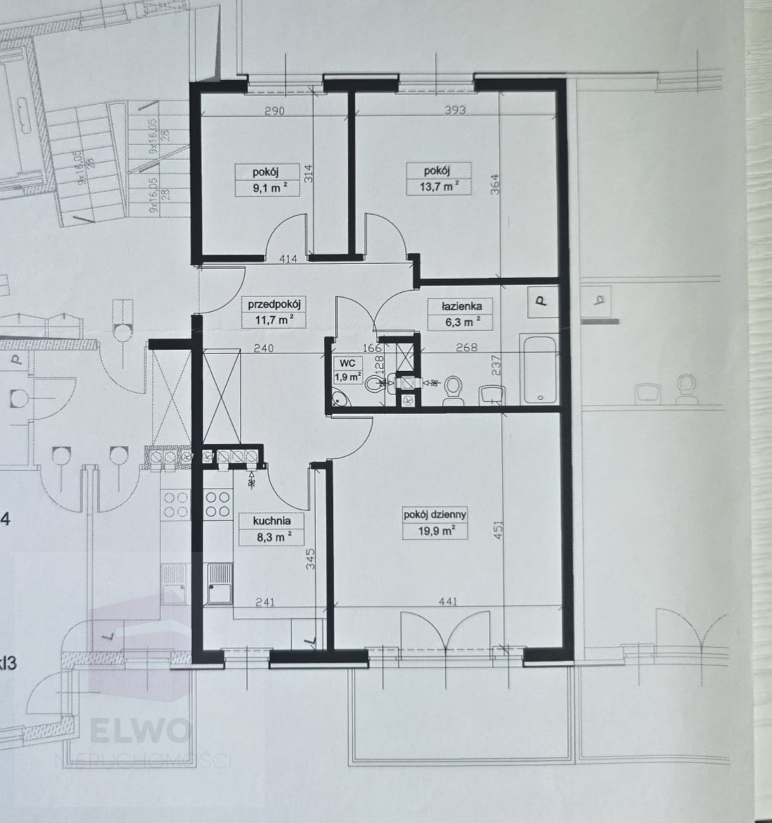 - salon 19.90 m2 z wyjściem na duży balkon 4m 2, dwóch sypialni 13,70 m2 i 9,10 m2 m2,oddzielnej , widnej kuchni 8,30 m2 ( zabudowanej i wyposażonej w sprzęt AGD),przedpokój 11,70 m2, łazienka 6,30 m2.