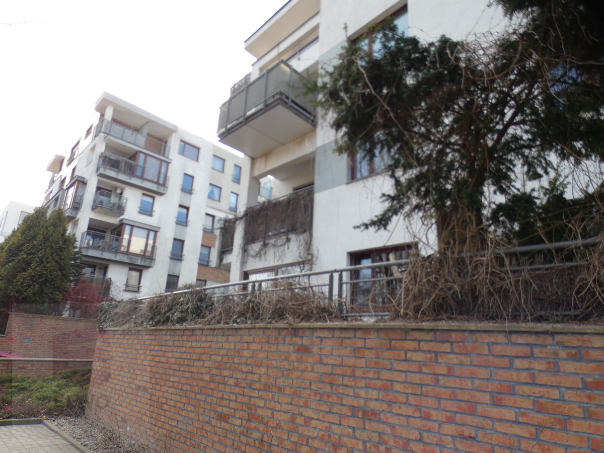 Nowoczesny ogrodzony budynek położony w pięknym cichym zielonym miejscu jednocześnie z dobrą komunikacją, blisko tramwaje, autobusy, metro około 2km.